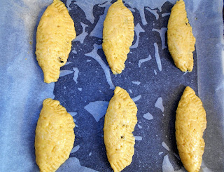 Βάζουμε στο κάθε ένα μια κουταλιά γέμιση και κλείνουμε σε μισοφέγγαρο